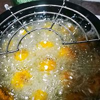 做法分解9:重新热油,油温七成热时,把丸子全部倒入锅中复炸,炸成枣红色捞出沥油。