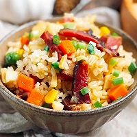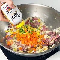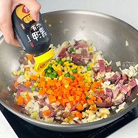 做法分解8:加入玉米粒、青豆、胡萝卜丁、挤入小鲜侣调味汁(这个调味汁从鸡肉、鱼肉、贝类等多种食材中提取,不添加防腐剂,是健康有肽无添加的安全调味品,给宝宝做菜也可放心食用);