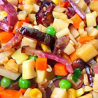 做法分解6:沥干水分切成笋丁、腊肉切丁、胡萝卜切丁待用;