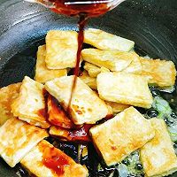 做法分解3:锅中放少量油,放入豆腐片煎至金黄色备用