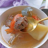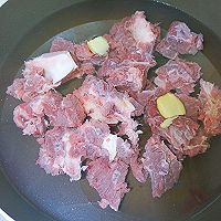 做法分解8:把牛骨,土豆和番茄全部放到高压锅里,加入料酒,蚝油,生抽,盐和适量清水