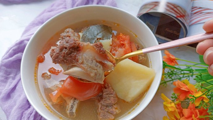 西红柿2个,土豆1个,牛骨500g,姜4片,八角1小个,生抽1勺,蚝油1勺,食盐一小勺,料酒2勺,香叶2片,桂皮1小块