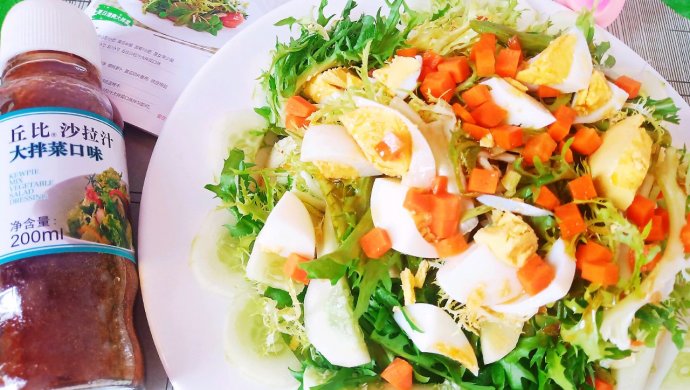 苦菊100g,胡萝卜1/5根,丘比大拌菜口味沙拉汁4勺,青瓜1条,鸡蛋1个