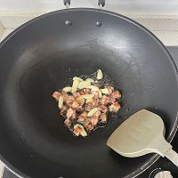 做法分解5:坐锅起油,放入蒜片、香肠丁,炒出香味。