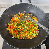 做法分解3:再加入玉米粒、胡萝卜粒继续焯水1分钟。