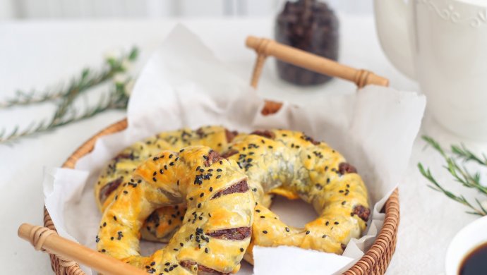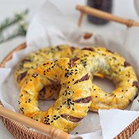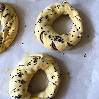 做法分解4:做成一个圈,刷上鸡蛋液,撒上一些黑芝麻。