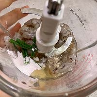 做法分解5:虾仁倒入小熊辅食机中,加入盐、胡椒粉、蛋清、小葱、玉米淀粉