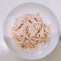 做法分解4:过凉水后就可以动手撕了,如果不喜欢用手的小伙伴,可以用刀切,方便省力.将加工好的鸡胸肉装盘备用.