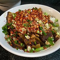 总结:水开放香干和调味料,汤汁收浓稠出锅,热油泼在葱姜蒜辣椒末上即可。来自此人月半的作品。