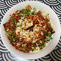 做法分解4:表面撒上葱姜蒜末、辣椒末,烧油,油热后泼在这些末上爆香