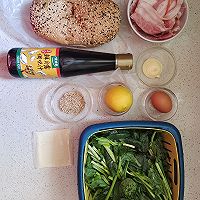 谷物面包1个,菠菜1小把,鸡蛋1个,培根3个,柠檬0.5个,芝士片1片,蛋黄酱1勺,芝麻1茶匙,黑胡椒碎1茶匙,太太乐鲜贝露2茶匙