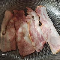 做法分解7:锅中喷薄油,小火煎培根片至微微焦黄;