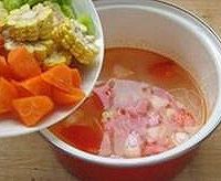 做法分解4:大火煮开后放入胡萝卜、莴苣笋、甜玉米