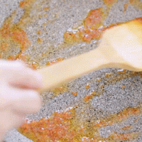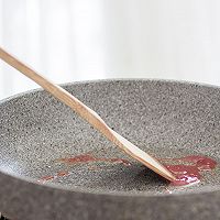 做法分解10:接下来准备下酱汁。把10g番茄酱和5g细砂糖倒入锅中,炒至细砂糖融化。