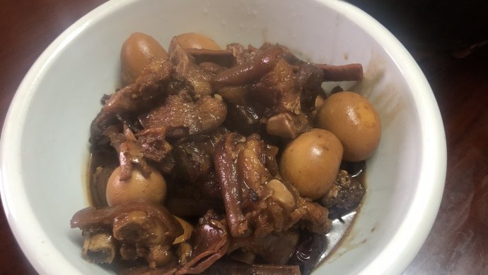 猪手1个,干鱿鱼2只,鸡蛋5个,新会陈皮3/1片,姜6片,蒜头3颗,酱油适量,盐适量,白糖适量,料酒适量,老抽适量,黄豆酱勺