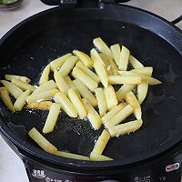 做法分解4:锅中加少许食用油,下入土豆条,煎到土豆条金黄,捞出备用