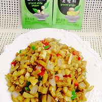 做法分解9:再放入青红椒丁和大蒜末翻炒半分钟即可出锅享用