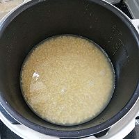 做法分解1:脱皮绿豆加足量水浸泡4小时以上,倒入高压锅,预留两指左右的水,压熟