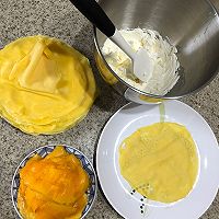 做法分解11:取一张饼皮,抹上奶油,加芒果片。再加一张饼皮,再抹奶油,加芒果片......