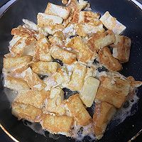 做法分解4:锅里烧油,油热后放入豆腐煎至两面金黄后盛出备用