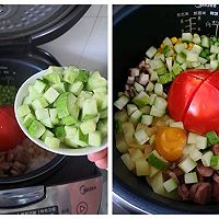 做法分解4:电饭锅里准备3人份的大米,淘洗干净,倒入刚刚没过大米的清水,把之前准备好的食材(除黄瓜丁外)依次摆放好,摆成彩虹造型,中间放入番茄,根部朝下,把调好的料汁均匀淋在除番茄外的所有食材上。
