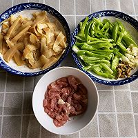 做法分解2:把鱿鱼干青椒猪肉切条姜蒜切沫