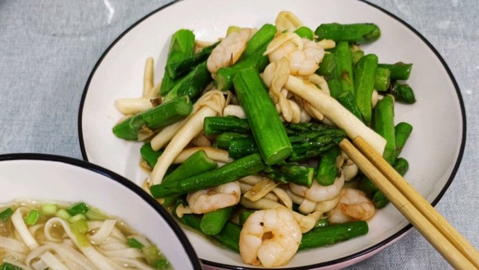 一个人,一道菜。下了班,时间就是自己的,最近迷上了吃芦笋和虾仁,搭配一碗面条,一份简单的晚餐。