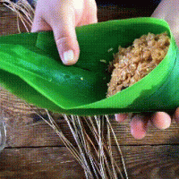 做法分解6:取两片粽叶从中间折出三角形状,先加入三分之一的糯米压实,加入咸蛋黄,三层肉,香菇,鲍鱼干,板栗,再放上适量糯米盖好馅料。