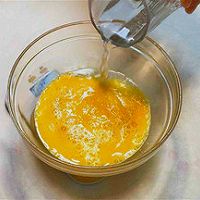 做法分解4:碗里打入两个鸡蛋,用手动打蛋器搅拌均匀后加入蛋液1.5-2倍的温开水。