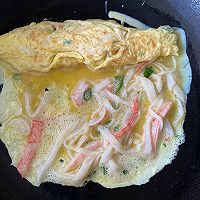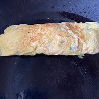 做法分解6:然后倒入剩下1/2的蛋液,要渗到之前蛋卷下面,可以用铲子将蛋卷抬起来,让蛋液流到下面,这样就能很好地衔接起来,稍微凝固一点,就可以把蛋皮卷起来了。