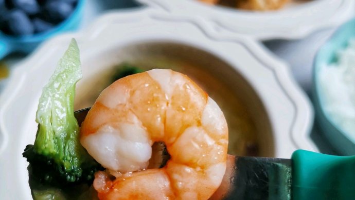 虾仁4只,娃娃菜2片,西兰花5克,香菇半个,酱油适量,食盐适量,虾皮粉适量