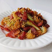 菜花小半个,培根三片,孜然粉看,辣椒面着,香料粉搁,盐可换,油可省,熟芝麻可选