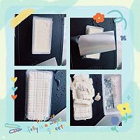 豆腐脱盒小技巧:倒扣豆腐盒,用刀拍一下底部,将4角钱切开小口,豆腐就能整块脱盒。来自米小菟的作品。