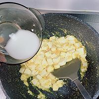 做法分解5:锅里放入适量食用油,依次倒入咸蛋黄翻炒30秒,再倒入豆腐翻炒均匀,加入高汤(炖鸡汤时会加入,平时没有就省去高汤,味道也不错)。