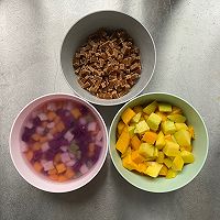 做法分解5:煮点小芋圆,山楂、芒果切丁备用;还可以放珍珠小圆子、西瓜、水蜜桃、葡萄干、花生碎等等等等…家里有什么放什么