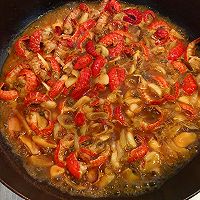 做法分解6:炖至汤汁呈这个程度、虾尾基本上也完全熟了、辣椒下锅稍微翻炒一下就可以了(韩式辣椒酱、酱油、蚝油都有咸味儿、所以我没有再放盐了、咸淡刚好)