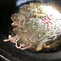 做法分解5:加肉丝,肉丝今天被我切太细了加点盐,稍微过一下锅肉丝变色即可盛出,留底油。