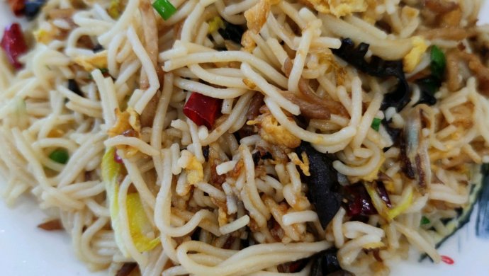 泡好的米粉2团,肉丝50g,白菜80g,木耳30克,五花肉20克,鸡蛋2个,干辣椒圈1小把,葱花1根,盐1小勺,鸡精1小勺,生抽1汤匙,料酒1汤匙