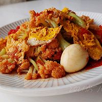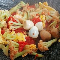 做法分解2:盖上盖子中火焖它一两分钟,开盖随手碾碎些倒上提前收拾干净统一好队形的花菜们