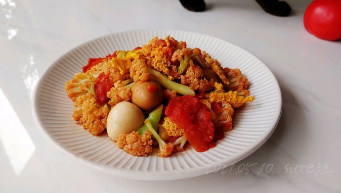 西红柿一个,鸡蛋一个,鹌鹑蛋可选,菜花半个,生抽可换,油一点点