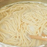 做法分解5:我用的是碱水棍棍面(干面),煮好的面过冷水沥干备用。如果是鲜面条,蒸12分钟,加菜油拌匀摊开晾干。