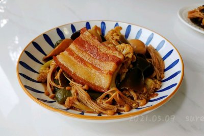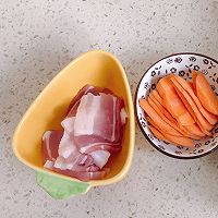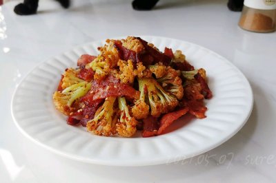 有机花菜一颗,五花肉150g,油适量,酱油1勺,胡萝卜一段,蚝油1勺