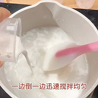 做法分解6:锅中两杯清水煮开,半杯白糖煮融化后熄火,取一勺椰浆生浆,边倒入边迅速搅拌至浓稠,得到椰浆熟浆。
