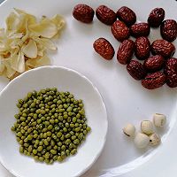 绿豆(清热解暑)100g,红枣(补血养颜)十几个,白糖2勺,莲子五粒,百合干一把