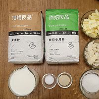 面团:老面100克,面团:全麦粉150克,面团:高筋面粉400克,面团:干酵母5克,面团:盐5克,面团:细砂糖20克,面团:牛奶400-425克,面团:黄油55克,面团:鸡蛋液少许,酥皮:杏仁粉30克,酥皮:无盐黄油90克,酥皮:糖粉75克,酥皮:鸡蛋液45克,酥皮:奶粉18克,酥皮:高筋面粉190克