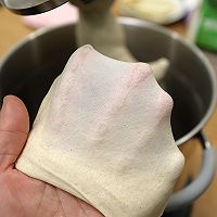 做法分解4:低速搅拌使黄油完全融入面团,转高速搅打,面团柔软不粘盆壁,能撑出透明有弹性的薄膜;