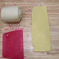 做法分解18:酥皮面团擀成与吐司卷同宽的面片,边缘借助刮板整形;