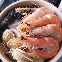 做法分解7:将食材码去坛子中,放入清洗干净飞水的大海虾,清洗干净去皮的香螺,泡发好的鱼胶。