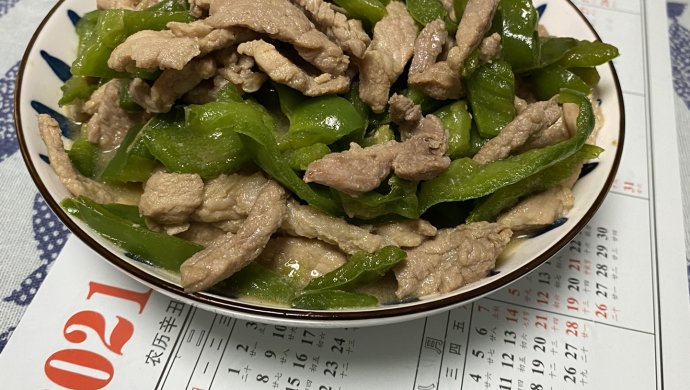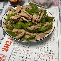 做法分解3:热锅下油,放入青椒炒断生,加入肉片翻炒。