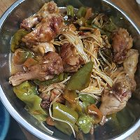 做法分解4:热锅加油放入腌制好鸡腿煎出金黄色加入青椒金针菇,又碗调好料,可乐半瓶300毫升,加入生抽,耗油,蒜蓉酱鸡精,许盐搅拌好倒入锅中盖锅焖八分钟出锅即可
